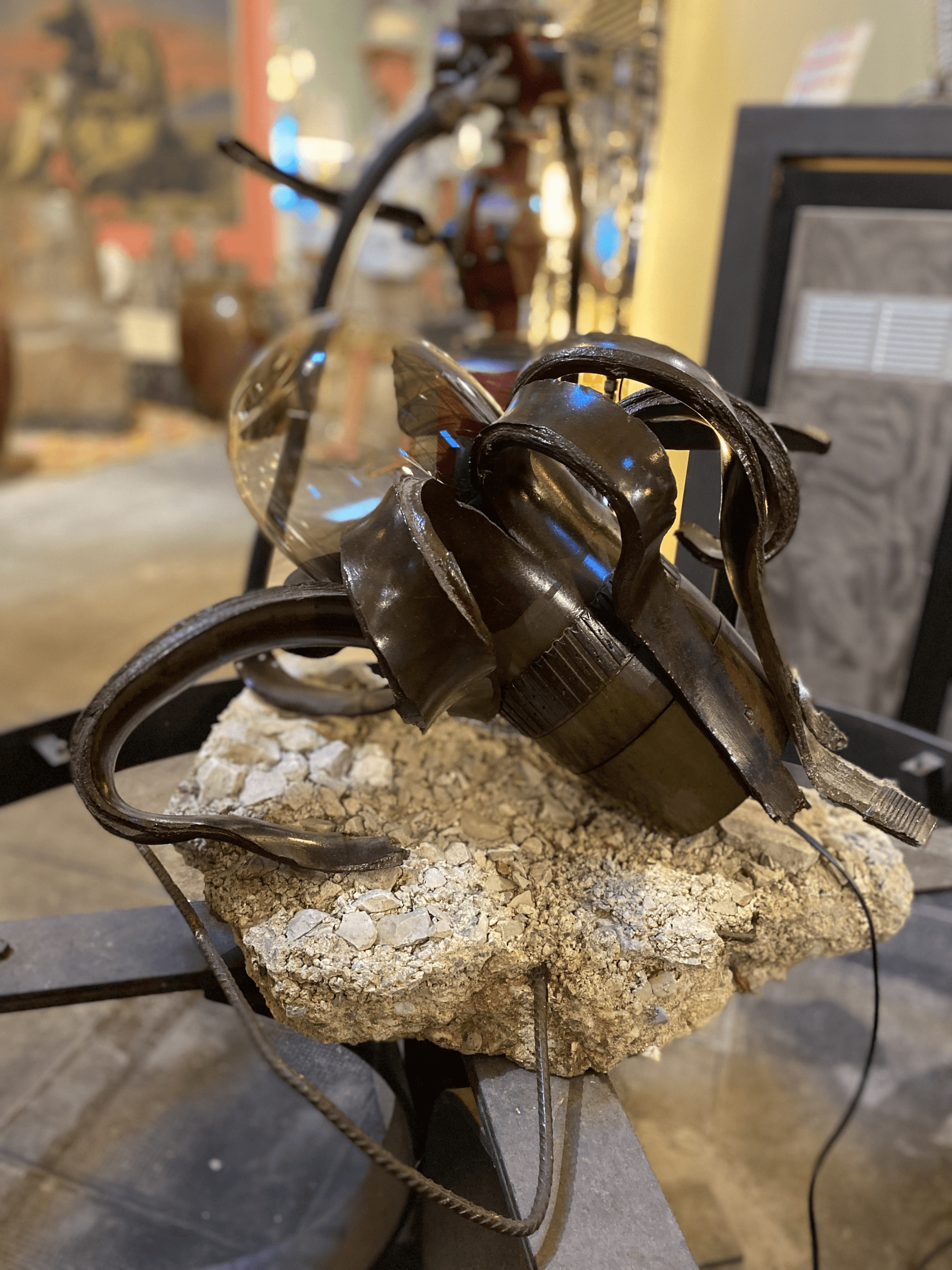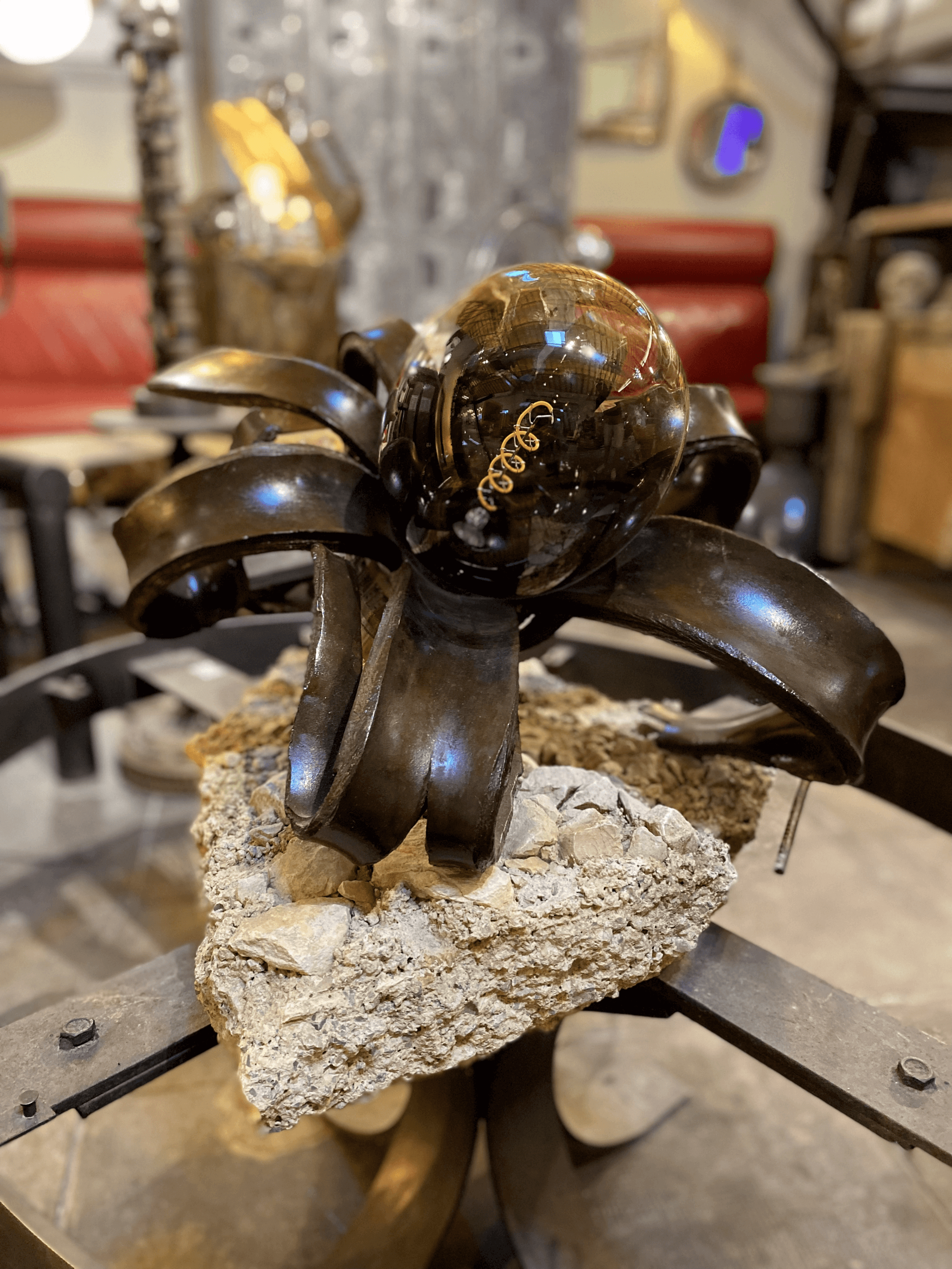 Made from an old shell discovered using a metal detector near Verdun, this lamp created by Jean-Pierre Noble is a unique piece whose shape is due to the explosion of the projectile in the ground, which is what gave it this appearance similar to a flower or an octopus!